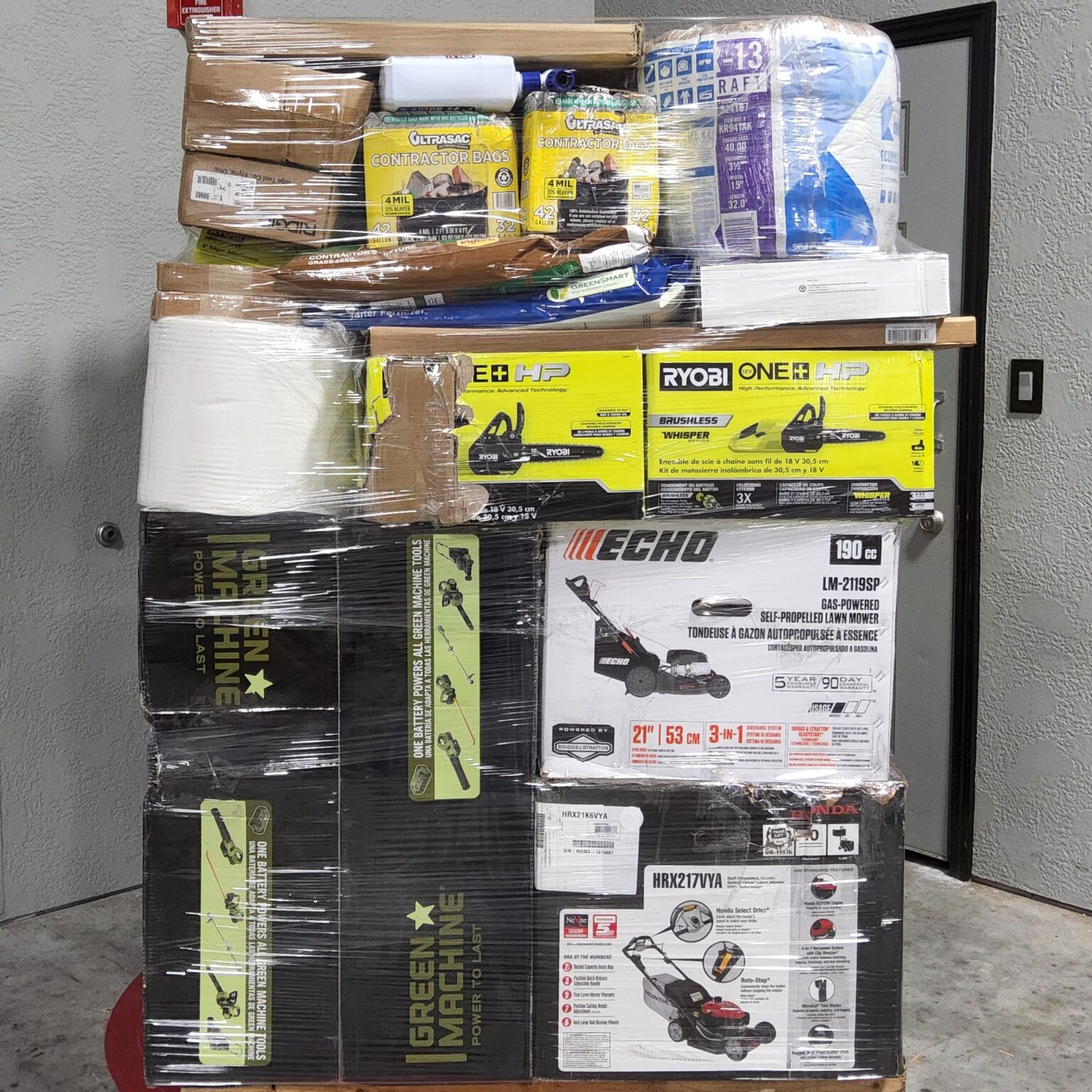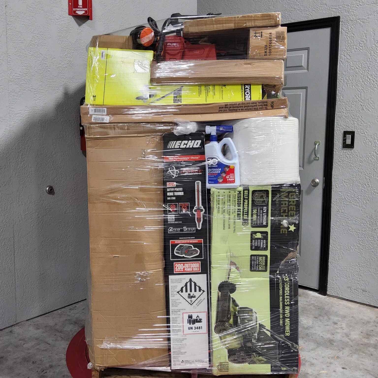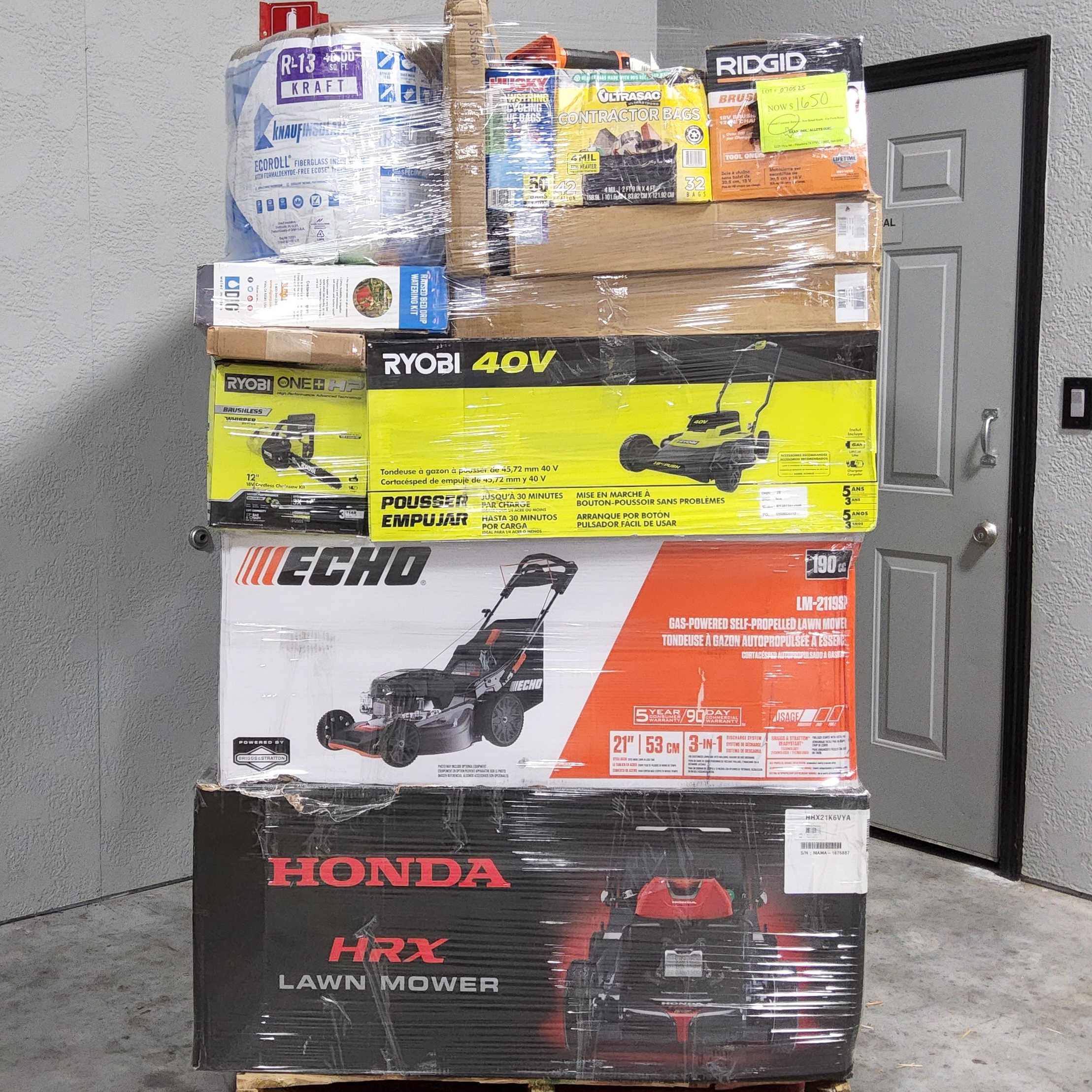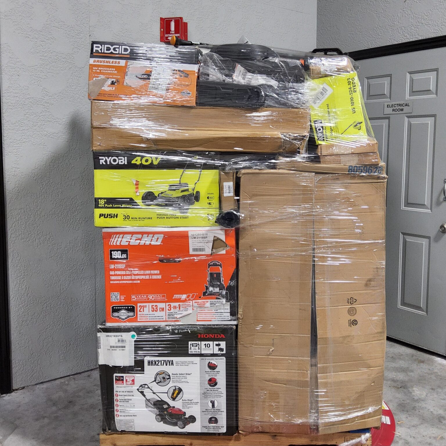 Get your hands on a premium wholesale pallet of 20 brand new mowers and outdoor tools, featuring top-performing brands like Ryobi, DeWalt, Echo, Honda, and Ridgid. Each unit is factory-sealed and ready for resale or contractor use.
